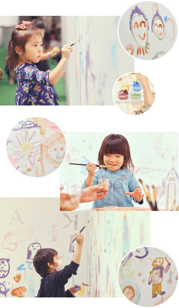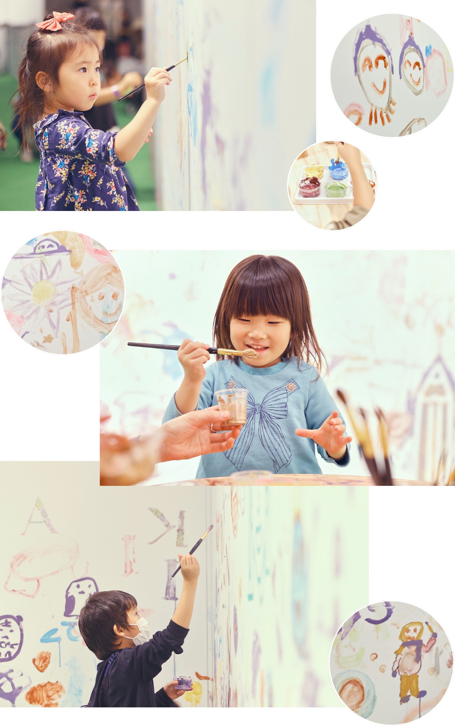 化粧品からできた絵具のきらめきに思わず笑顔になる子、壁や絵具の質感が新鮮で集中する子、自分より高い壁を目のまえに緊張感をかんじる子、日常とは少し異なる空間や絵具で思考が刺激され、また新たな自分の可能性に気づいてもらえたらと思います。