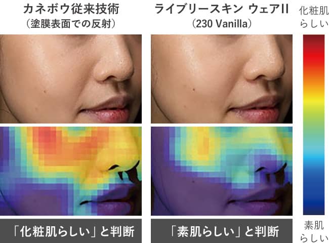 「ライブリースキン ウェアⅡ」の肌仕上がりを、素肌と化粧肌の違いを判別する花王が開発した印象評価AIにかけ、AIは化粧肌を素肌らしいと判断。