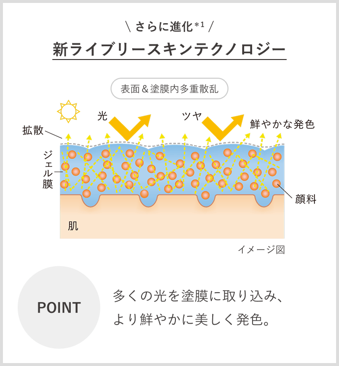 本来、ファンデーションを重ねるほどに失われる素肌感※1。なめらかな塗膜表面によるつややかな光の反射効果と、多くの光を取り込んだ塗膜内部での高い光拡散効果で、素肌らしさと高いカバー効果の両立を実現。