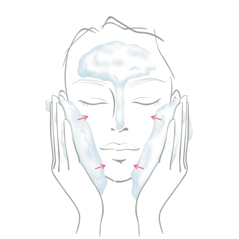 2. 顔全体を包み込むように、やさしく泡を広げます。直接手が触れないように、肌に泡をやさしく押しあてて、汚れを吸着させながら洗います。
