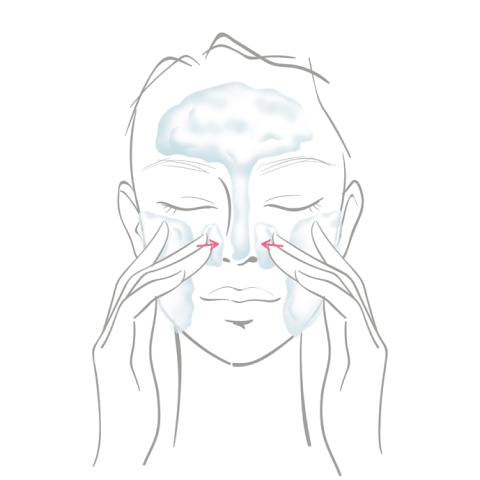 3. 目のキワなどの細かい部分や、汚れが気になる小鼻は、指の腹を使って、やさしく泡を押しあてます。