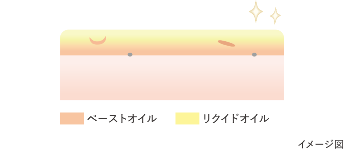 なじみやすくべたつかないローズヒップオイル(保湿)などを含む「リクイドオイル」と、ぴったり密着し膜感で守る胎脂着想成分ベビーソフトオイルコンプレックスを含む「ペーストオイル」を掛け合わせ、肌にのせた瞬間から、あと肌まで、うるおいヴェールで全身をラッピング。