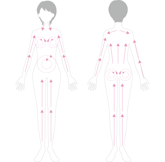 - 腕や脚は手首や足首から付け根に向かって、バストやお腹、お尻は円を描くようになじませます。ざらつきやすい部位は、よりていねいになじませます。
