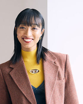 〈伊藤亜和さん衣装〉ビスチェ¥46,200、ニット¥61,600、パンツ¥78,100、パンプス¥128,700/ディーゼル(ディーゼル ジャパン 0120-55-1978) ジャケット/スタイリスト私物 ピアス/参考商品(キャリアリング)