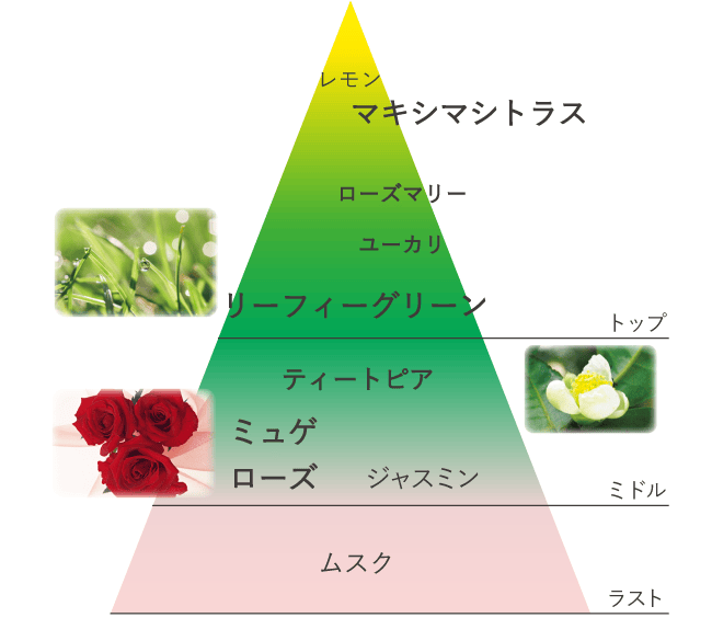 茶花の香り「ティートピア」をアクセントに、朝のみずみずしい緑と花々をイメージしたフレッシュフローラルの香り。