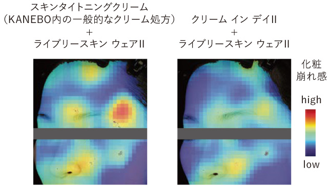 印象評価AIも、クリーム イン デイⅡ塗布時の方が、化粧崩れ感が少ないと判断。