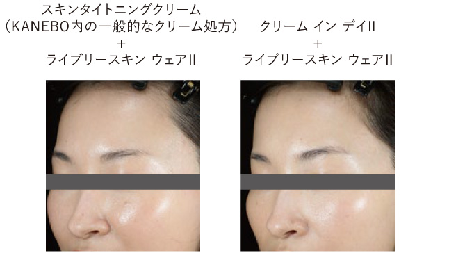 一般的なクリームにファンデーションを重ねた肌は、強いテカリが目立つ一方、クリーム イン デイⅡにファンデーションを重ねた肌は、額側面のテカリが目立たず、頬骨の高い位置にきれいなツヤが出ています。
