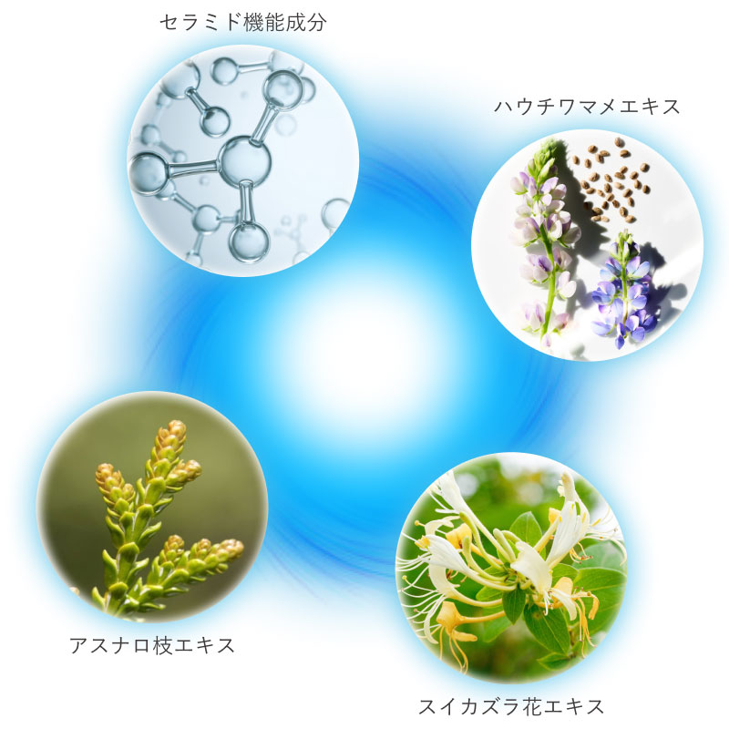 ※1 セラミド機能成分(セチルPGヒドロキシエチルパルミタミド)、ハウチワマメエキス(加水分解シロバナルーピンタンパク)、エチルグルコシド、スイカズラ花エキス、アセチルグルコサミン、アスナロ枝エキス
