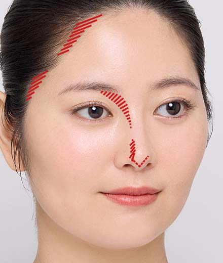 生え際にシェーディングを入れることで額の輪郭を自然に整えます。鼻筋の横や鼻先に入れると立体感が強調されシャープな印象に。目もとなどの他のパーツを引き立てます。