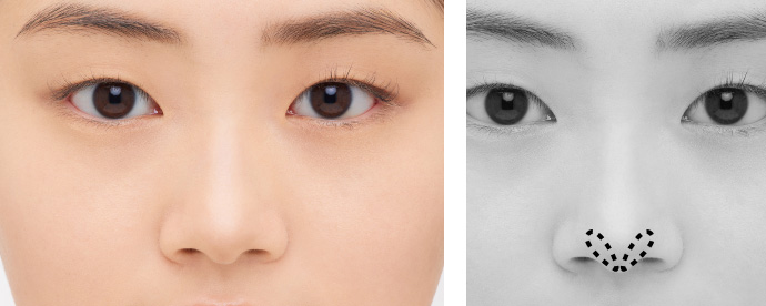 鼻筋の横だけでなく、鼻先に塗布し、より高くシャープにみせる。
